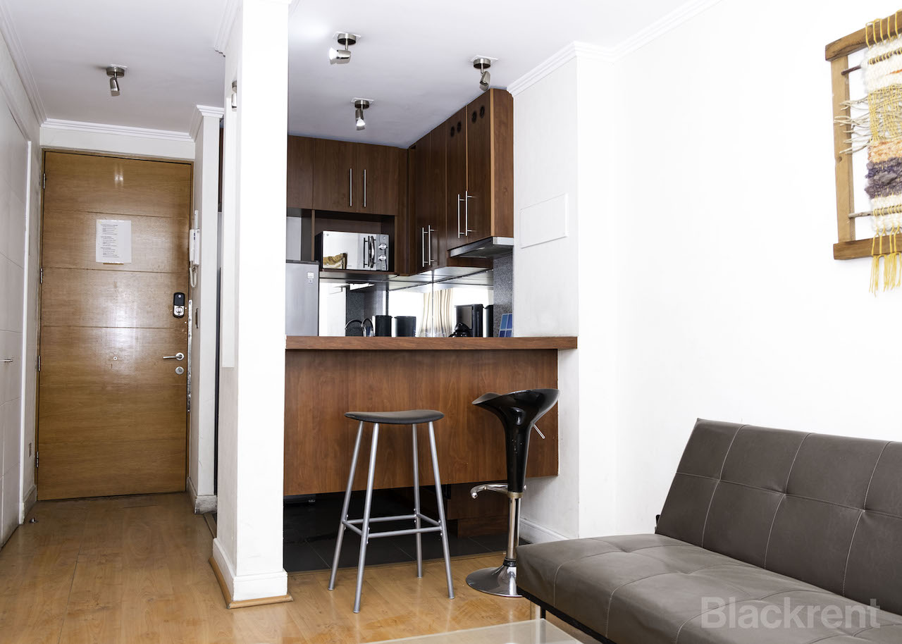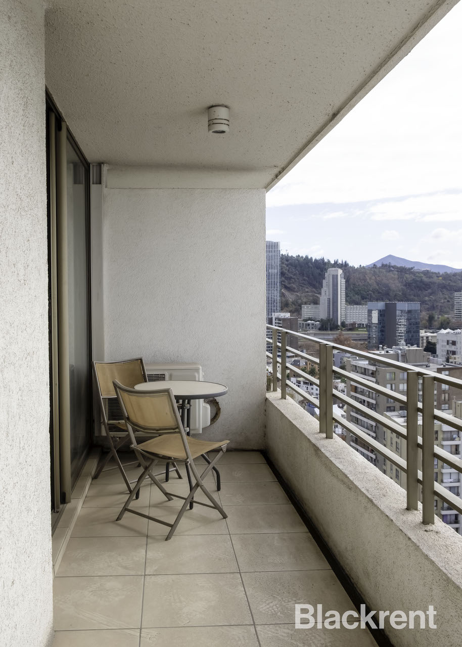 El departamento cuenta con cocina americana equipada, 1 amplio dormitorio y cómodo baño, además Aire Acondicionado y Calefacción. Se destaca su amplia terraza con vista asegurada a Santiago.