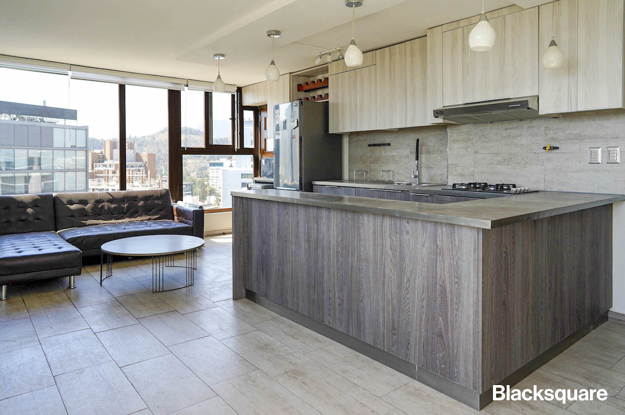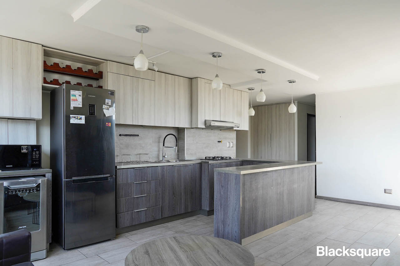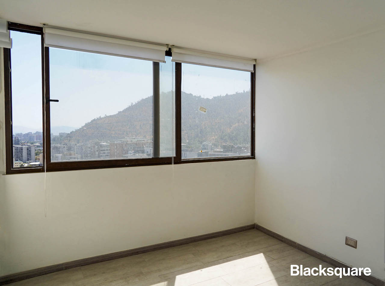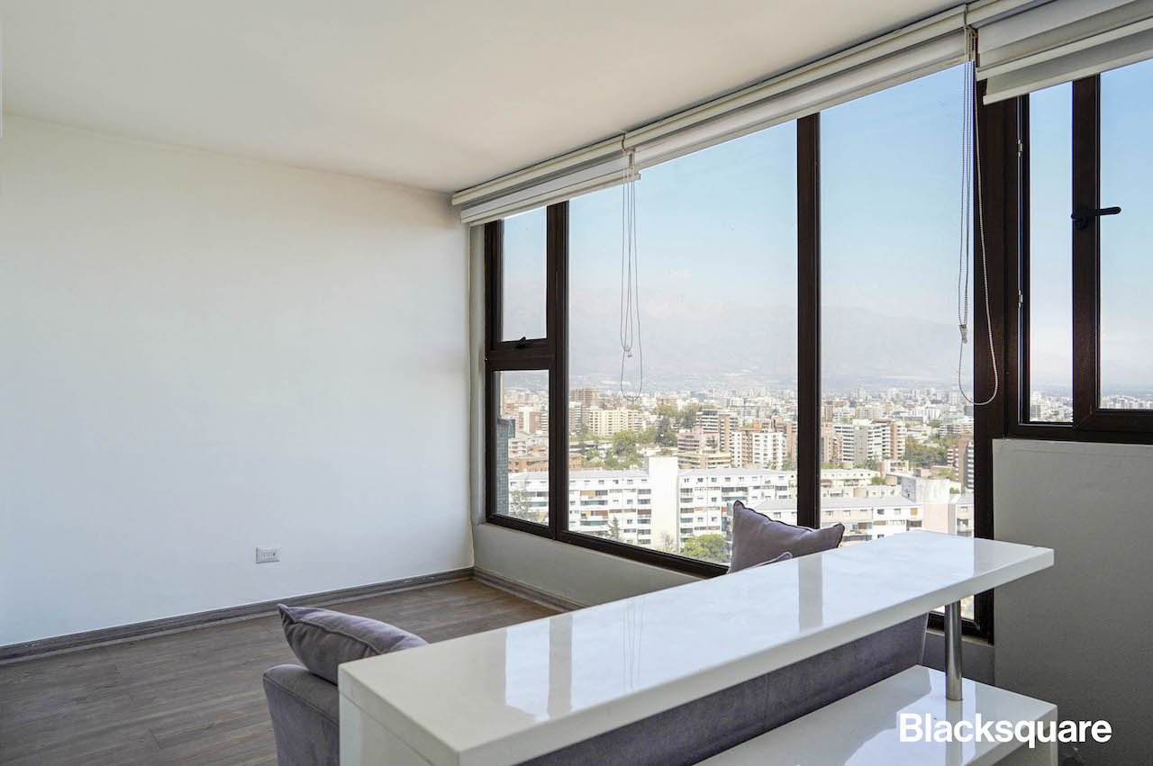 Se ingresa al departamento y nos encontramos con un amplio living comedor, el que está integrado con la cocina americana, la que está totalmente equipada. Se destaca la increíble vista despejada al cerro Manquehue y cordillera. Luego, tenemos un dormitorio con su baño, para encontrarnos con el dormitorio principal, con vista a la cordillera. El tercer dormitorio comparte el baño con el principal.