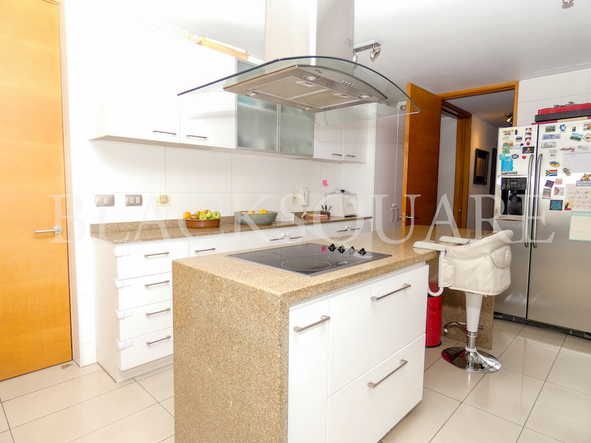 La cocina cuenta con cocina vitrocerámica, horno eléctrico, cubierta de granito, mesón isla de gran comodidad para cocinar y loggia. Además, tiene baño de servicio.