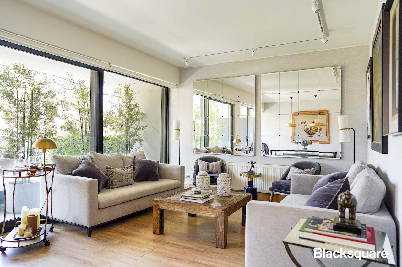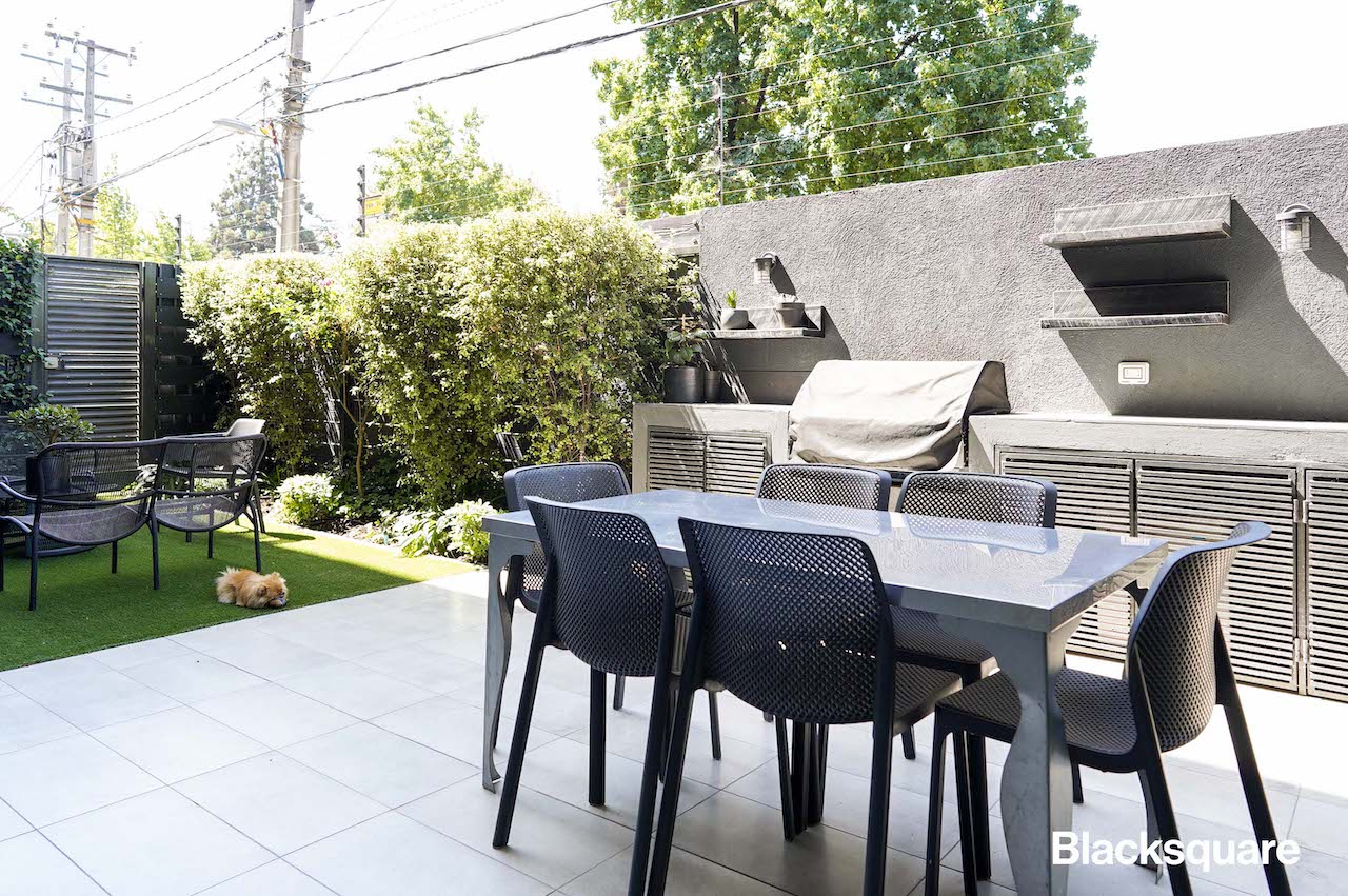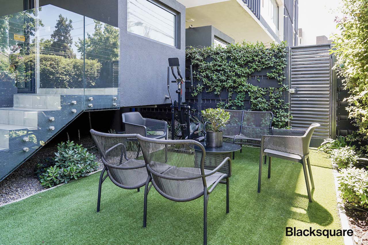 Se accede al departamento a través de un hall, el que nos lleva al living comedor, cocina y sector de dormitorios. El living comedor, de amplios espacios y muy iluminado, cuenta con baño de visitas. Además, en su terraza hay una escalera con la que se accede al patio, el que cuenta con quincho y espacios para un living y comedor de terraza.