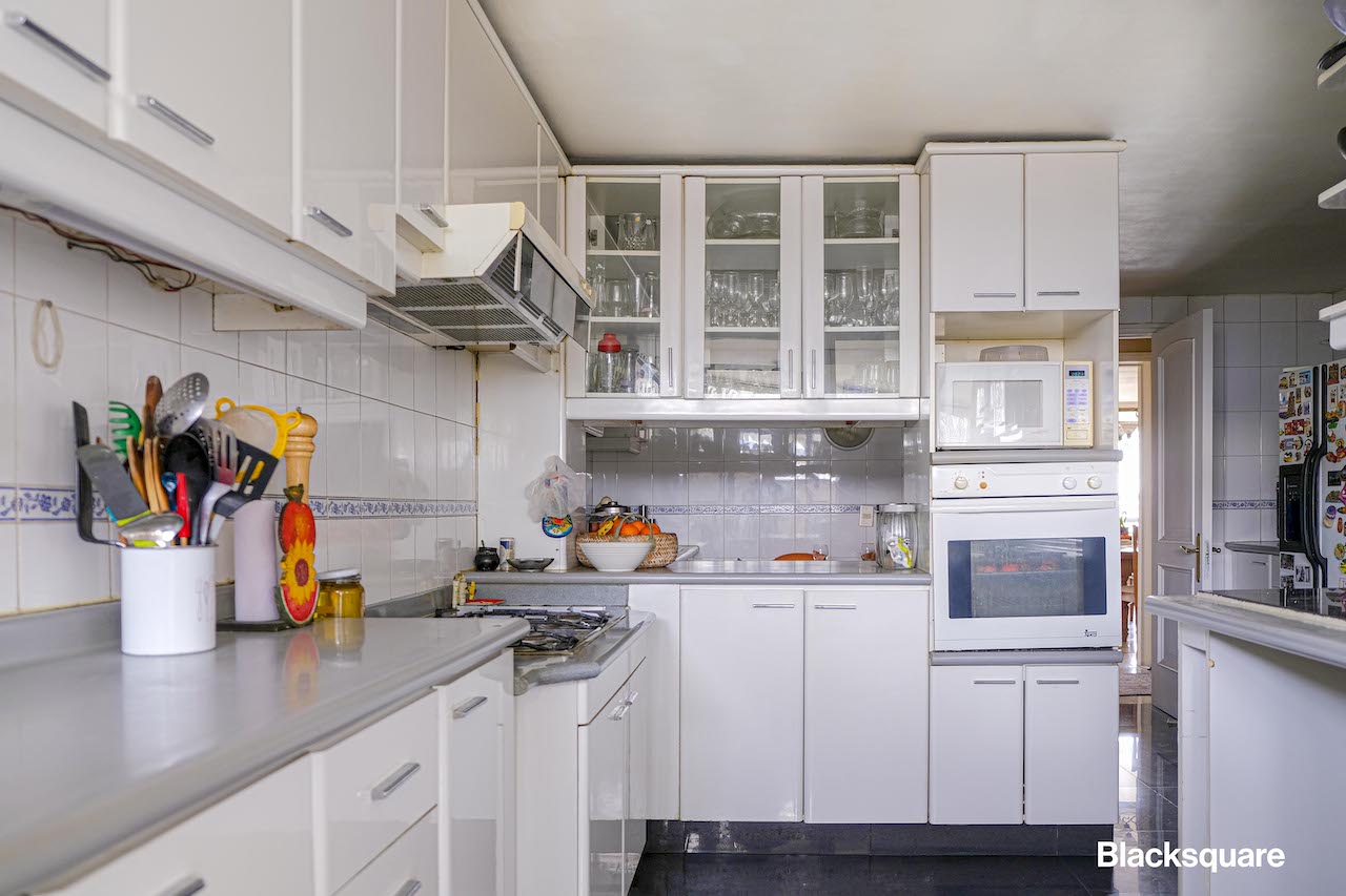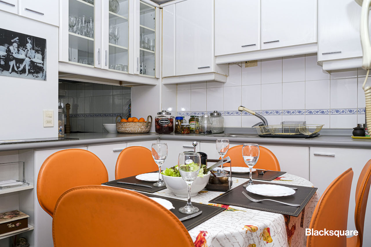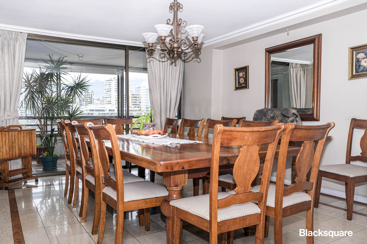 Luego se encuentra la amplia cocina, totalmente equipada, con comedor de diario y salida a una logia de tamaño fuera de lo normal. Contigua a ella está el dormitorio de servicio con su baño.