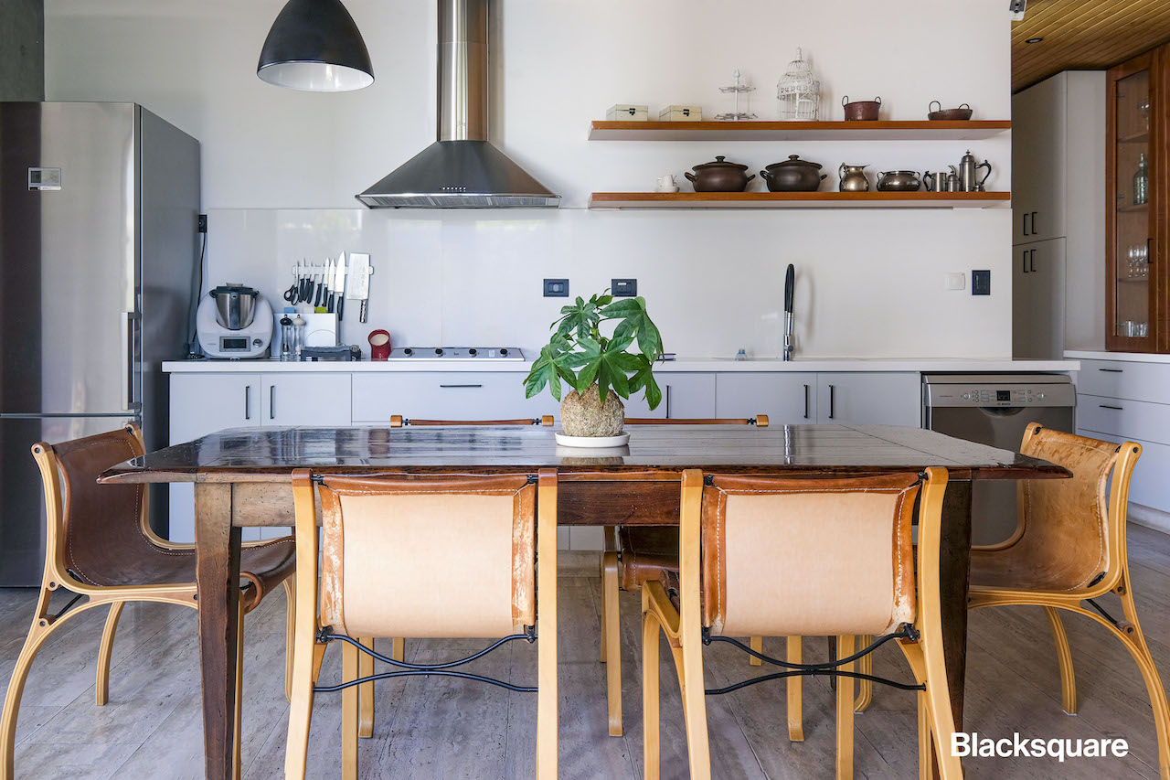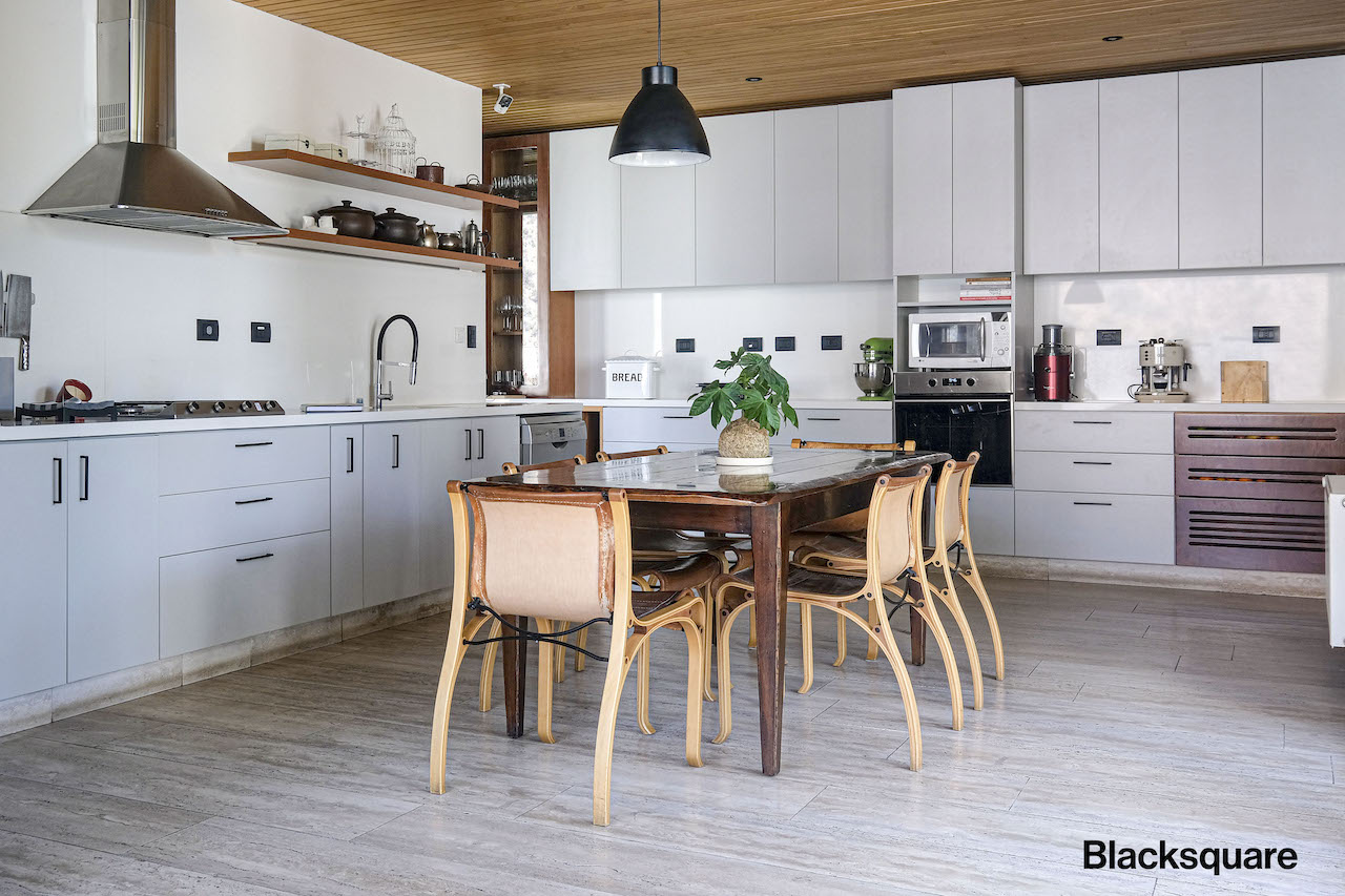 Integrada al living comedor, se encuentra la cocina, muy amplia y totalmente equipada, cuenta con un patio interior, el que le entrega la iluminación característica de todos los espacios de la casa. Adicional, hay un patio de servicio, con logia, bodega y un dormitorio de servicio con su baño.