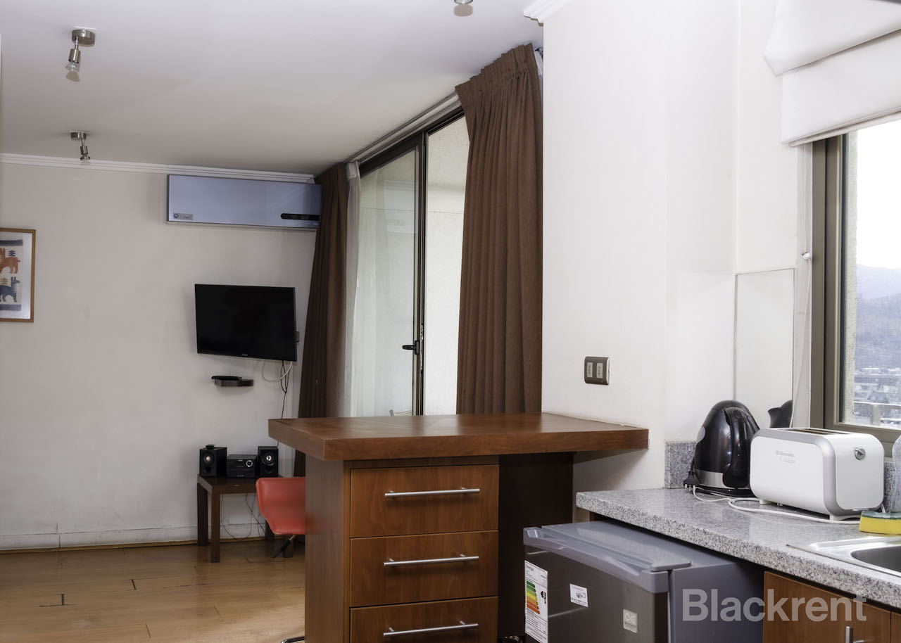 El departamento cuenta con cocina americana equipada, 1 amplio dormitorio y cómodo baño, además Aire Acondicionado y Calefacción. Se destaca su amplia terraza con vista asegurada a Santiago.