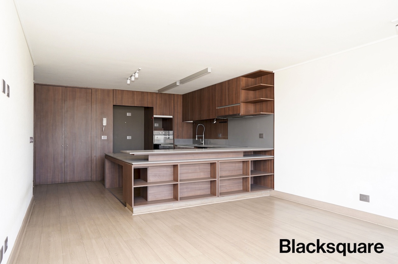 Al acceder al departamento, nos encontramos con un amplio living comedor con vista despejada, en que se destaca la gran cocina americana, la que está totalmente equipada y tiene unas amplias cubiertas de granito, que hacen que esta sea el centro del departamento. El living tiene acceso a una gran terraza, la que recorre todo el departamento y también tiene vista despejada asegurada.