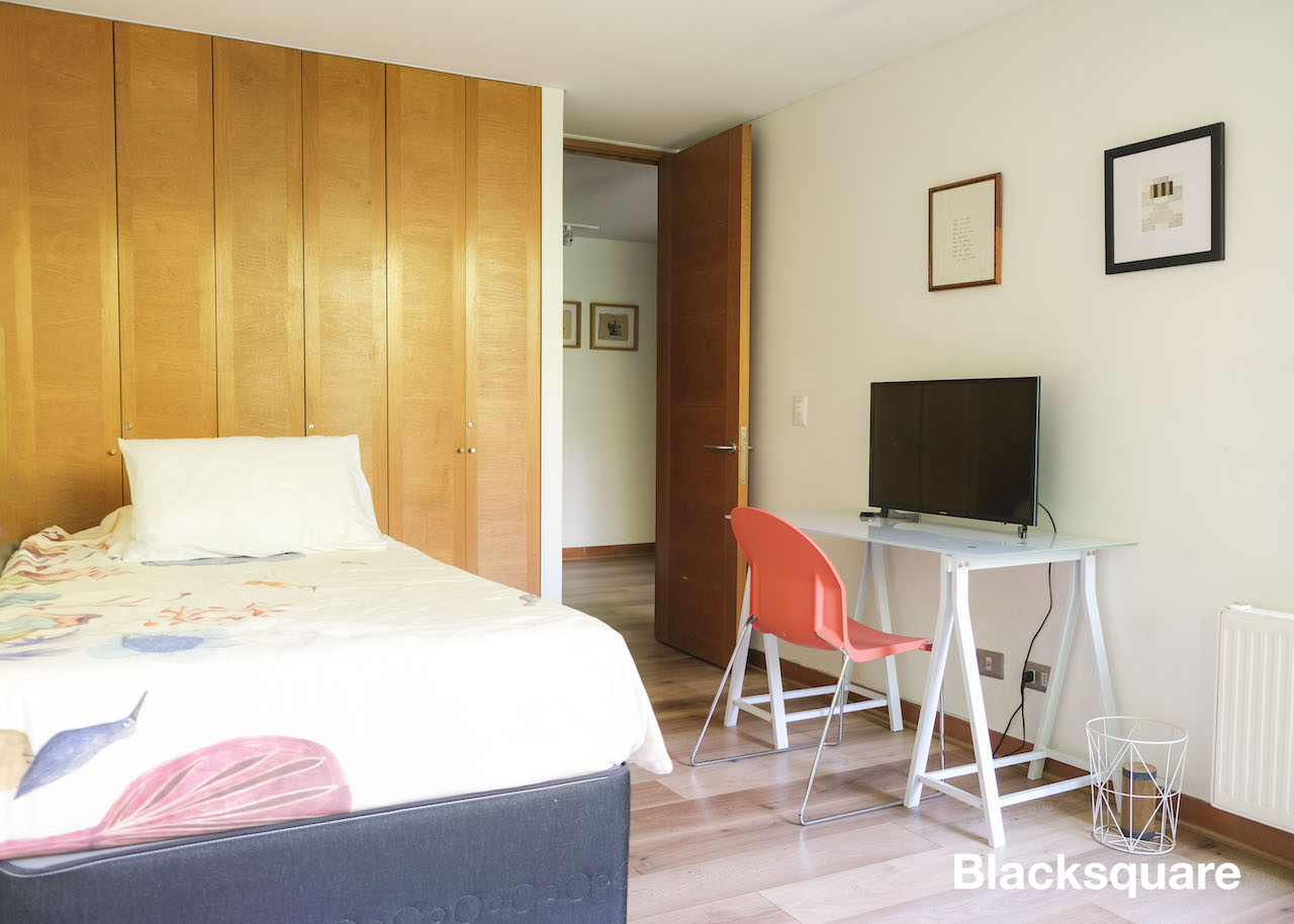 Cuenta con un amplio living comedor, con salida a una terraza que se extiende a una segunda terraza, emplazada en el gran jardín, en que este último se mezcla con los parques del edificio, con senderos que llevan a una piscina inmersa en la naturaleza.